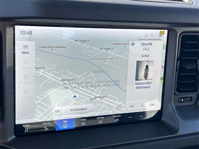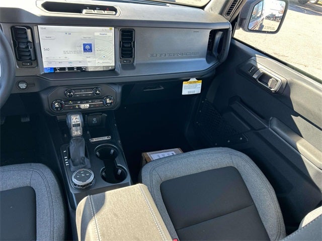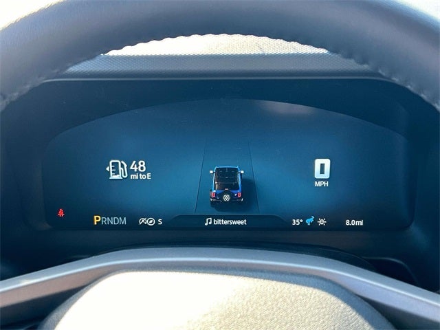 This vehicle includes the following features and options: Black Appearance Package (Black Molded-In-Color Door Handles, Black Molded-In-Color Fender Flares, Black Molded-In-Color Sideview Mirror Caps, and Black-Painted Molded-In-Color Grille), Equipment Group 222A Mid Package (2-Door Intelligent Access w/Lock/Unlock, Ambient Footwell Lighting, Connected Navigation, Dr & Pass Illuminated Sliding Visor Vanity Mirrors, Dual Smart Charging USB Ports, Dual-Zone Electronic Automatic Temperature Control, Front Row Heated Seats, Power Outlet - Back Side of Center Floor Console, and Rear Parking Sensors), 4-Wheel Disc Brakes, 4.46 Axle Ratio, 7 Speakers, ABS brakes, Air Conditioning, Alloy wheels, AM/FM radio: SiriusXM with 360L, AM/FM Stereo, Auto High-Beam Headlamps, Auto High-beam Headlights, BLIS Blind Spot Information System, Brake assist, Cloth Bucket Seats, Compass, Delay-off headlights, Driver door bin, Driver vanity mirror, Dual front impact airbags, Dual front side impact airbags, Electronic Stability Control, Emergency communication system: 911 Assist, Exterior Parking Camera Rear, Front anti-roll bar, Front Bucket Seats, Front Center Armrest, Front reading lights, Front wheel independent suspension, Fully automatic headlights, Hard Top Sound Deadening Headliner, Heated door mirrors, Illuminated entry, Integrated roll-over protection, Internet access capable: FordPass Connect, Lane-Keeping System, Leather Shift Knob, Low tire pressure warning, Occupant sensing airbag, Outside temperature display, Overhead airbag, Overhead console, Panic alarm, Passenger door bin, Passenger vanity mirror, Power door mirrors, Power steering, Power windows, Pre-Collision Assist w/Automatic Emergency Braking, Radio data system, Rear-View Camera, Rear-Window Defroster & Washer, Remote keyless entry, Security system, Shadow Black Painted Hard Top, SiriusXM w/360L, Speed control, Split folding rear seat, Steering wheel mounted audio controls, SYNC 4, Tachometer, Telescoping steering wheel, Tilt steering wheel, Traction control, Trip computer, Variably intermittent wipers, and Wheels: 17 Carbonized Gray-Painted Aluminum.