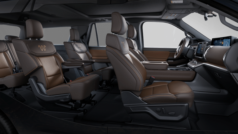 This vehicle includes the following features and options: Connectivity Package (One-Time Purchase), Equipment Group 400A Standard Package (BlueCruise Equipped (1-Year Plan)), 4WD, 22 Speakers, 3.73 Axle Ratio, 3rd row seats: split-bench, 4-Wheel Disc Brakes, ABS brakes, Adaptive suspension, Adjustable pedals, Air Conditioning, Alloy wheels, AM/FM radio: SiriusXM with 360L, Apple CarPlay/Android Auto, Auto High-beam Headlights, Auto-dimming door mirrors, Auto-dimming Rear-View mirror, Automatic temperature control, Brake assist, Bumpers: body-color, Compass, Delay-off headlights, Driver door bin, Driver vanity mirror, Dual front impact airbags, Dual front side impact airbags, Electronic Stability Control, Emergency communication system: 911 Assist, Exterior Parking Camera Rear, Four wheel independent suspension, Front anti-roll bar, Front Bucket Seats, Front Center Armrest, Front dual zone A/C, Front License Plate Bracket, Front reading lights, Fully automatic headlights, Garage door transmitter, Genuine wood dashboard insert, Genuine wood door panel insert, Heated door mirrors, Heated front seats, Heated rear seats, Heated steering wheel, Heated/Vent Prem Del Rio Lthr Fr Captain's Chairs, Illuminated entry, Leather steering wheel, Low tire pressure warning, Memory seat, Navigation System, Occupant sensing airbag, Outside temperature display, Overhead airbag, Overhead console, Panic alarm, Passenger door bin, Passenger vanity mirror, Pedal memory, Power door mirrors, Power driver seat, Power moonroof: Vista Roof, Power passenger seat, Power steering, Power windows, Radio data system, Radio: B&O Unleashed Sound System by Bang & Olufsen, Rain sensing wipers, Rear air conditioning, Rear anti-roll bar, Rear reading lights, Rear window defroster, Rear window wiper, Reclining 3rd row seat, Remote keyless entry, Security system, SiriusXM w/360L, Speed control, Speed-sensing steering, Speed-Sensitive Wipers, Split folding rear seat, Spoiler, Steering wheel memory, Steering wheel mounted audio controls, Tachometer, Telescoping steering wheel, Tilt steering wheel, Traction control, Trip computer, Turn signal indicator mirrors, Variably intermittent wipers, Ventilated front seats, Voltmeter, and Wheels: 22 Sinister Brown w/Diamond Cut Face Alum.