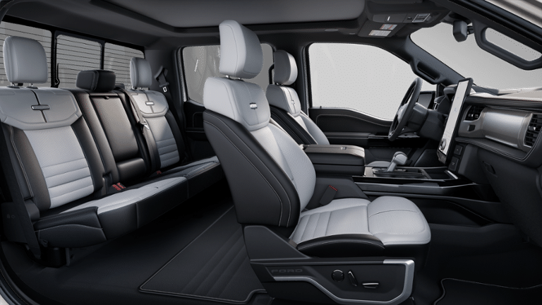 This vehicle includes the following features and options: Equipment Group 710A Standard, 14 Speakers, 4-Wheel Disc Brakes, ABS brakes, Adjustable pedals, Air Conditioning, Alloy wheels, Auto High-beam Headlights, Auto tilt-away steering wheel, Auto-dimming door mirrors, Auto-dimming Rear-View mirror, Automatic temperature control, Brake assist, Bumpers: body-color, Compass, Delay-off headlights, Driver door bin, Driver vanity mirror, Dual front impact airbags, Dual front side impact airbags, Electronic Stability Control, Emergency communication system: SYNC 4 911 Assist, Four wheel independent suspension, Front anti-roll bar, Front Bucket Seats, Front Center Armrest, Front dual zone A/C, Front License Plate Bracket, Front reading lights, Fully automatic headlights, Hard Folding Tonneau Pickup Box Cover, Heated door mirrors, Heated front seats, Heated rear seats, Heated steering wheel, Illuminated entry, Illuminated running boards, Internet access capable: FordPass Connect 4G, Knee airbag, Low tire pressure warning, Memory seat, Mobile Power Cord (120/240V), Navigation system: Connected Navigation, Occupant sensing airbag, Outside temperature display, Overhead airbag, Overhead console, Panic alarm, Passenger door bin, Passenger vanity mirror, Pedal memory, Power Deployable Running Boards w/Black Accent, Power door mirrors, Power driver seat, Power moonroof, Power passenger seat, Power steering, Power windows, Premium Nirvana Leather Bucket Seats, Radio data system, Radio: B&O Unleashed Sound System by Bang & Olufsen, Rain sensing wipers, Rear anti-roll bar, Rear reading lights, Rear seat center armrest, Rear step bumper, Rear window defroster, Remote keyless entry, Security system, Speed control, Speed-sensing steering, Split folding rear seat, Steering wheel memory, Steering wheel mounted audio controls, SYNC 4A w/Enhanced Voice Recognition, Telescoping steering wheel, Tilt steering wheel, Traction control, Trip computer, Turn signal indicator mirrors, Variably intermittent wipers, Ventilated front seats, and Wheels: 22 Bright Machined w/Ebony Black.