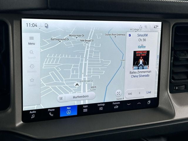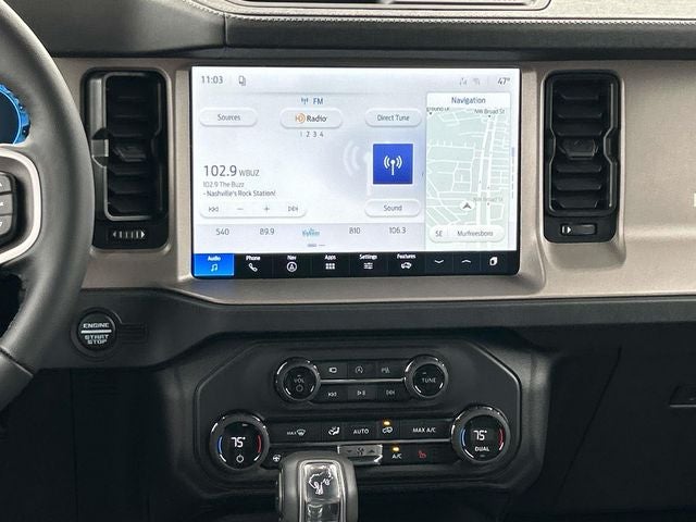 This vehicle includes the following features and options: Equipment Group 314A Lux Package (18 Bright Machined Aluminum Wheels, 3.73 Axle Ratio, 360-Degree Camera, Adaptive Cruise Control, Evasive Steering Assist, Front Parking Sensors, Heated Leather-Trimmed/Vinyl Bucket Seats, Information on Demand Panel, and Sideview Mirrors), Ford Connectivity Package (1-Year Included), 4-Wheel Disc Brakes, 7 Speakers, ABS brakes, Air Conditioning, Alloy wheels, AM/FM radio: SiriusXM with 360L, AM/FM Stereo, Auto High-beam Headlights, Auto-dimming Rear-View mirror, Automatic temperature control, Brake assist, Carbonized Gray Molded-in-Color Hard Top, Compass, Connected Navigation, Delay-off headlights, Driver door bin, Driver vanity mirror, Dual front impact airbags, Dual front side impact airbags, Electronic Stability Control, Emergency communication system: 911 Assist, Exterior Parking Camera Rear, Front anti-roll bar, Front Bucket Seats, Front Center Armrest, Front dual zone A/C, Front fog lights, Front reading lights, Front wheel independent suspension, Fully automatic headlights, Hard Top Sound Deadening Headliner, Heated door mirrors, Heated front seats, Heated steering wheel, Illuminated entry, Integrated roll-over protection, Leather Shift Knob, Low tire pressure warning, Navigation system: Connected Navigation, Occupant sensing airbag, Outside temperature display, Overhead airbag, Overhead console, Panic alarm, Passenger door bin, Passenger vanity mirror, Power door mirrors, Power driver seat, Power passenger seat, Power steering, Power windows, Radio data system, Rear seat center armrest, Rear-Window Defroster and Washer, Remote keyless entry, Security system, SiriusXM with 360L, Speed control, Split folding rear seat, Steering wheel mounted audio controls, SYNC 4, Tachometer, Telescoping steering wheel, Tilt steering wheel, Traction control, Trip computer, Upgraded Carpet Floor Mats, Variably intermittent wipers, and Voltmeter.