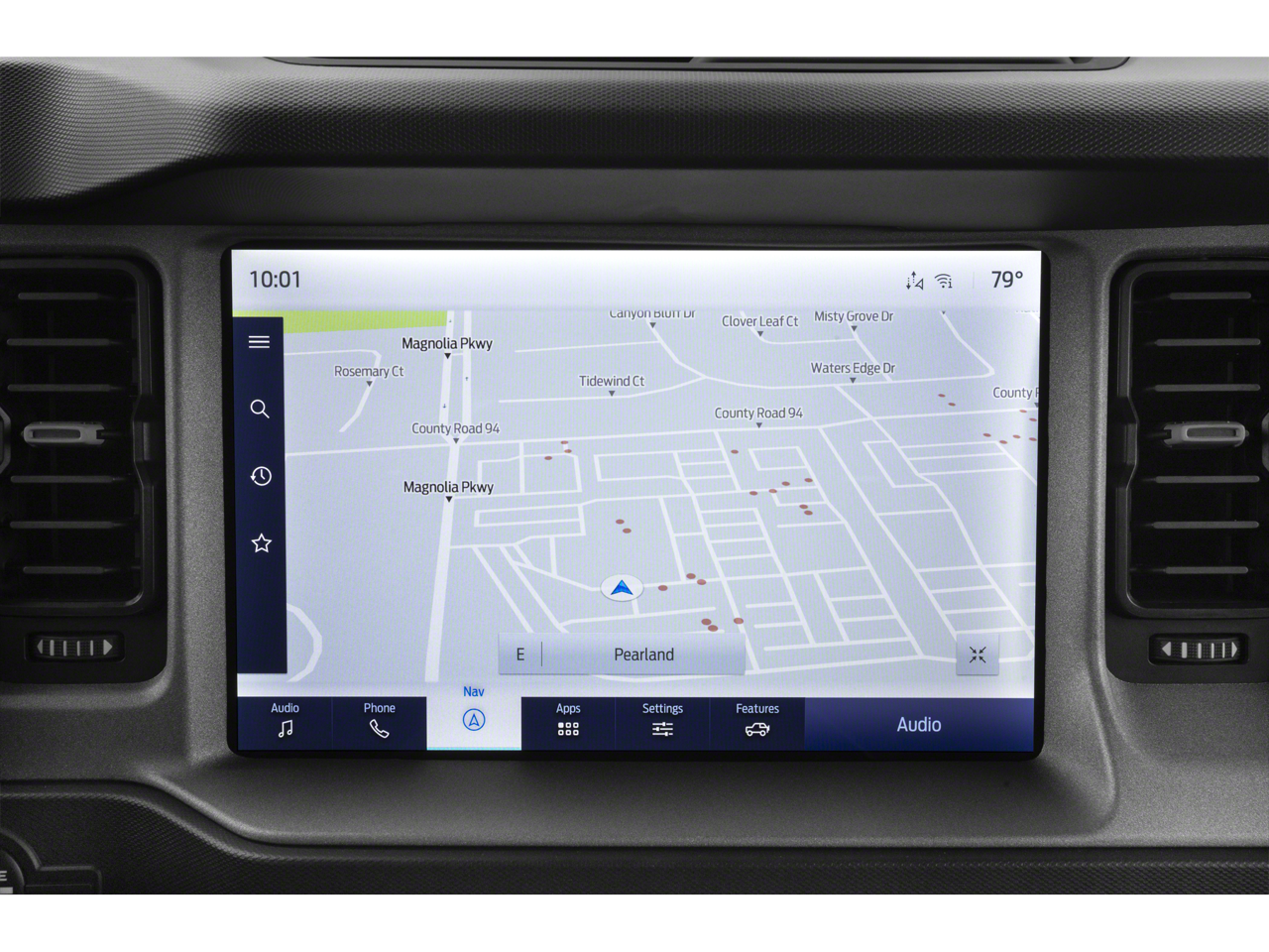 This vehicle includes the following features and options: Equipment Group 314A Lux Package (18 Bright Machined Aluminum Wheels, 3.73 Axle Ratio, 360-Degree Camera, Adaptive Cruise Control, Evasive Steering Assist, Front Parking Sensors, Heated Leather-Trimmed/Vinyl Bucket Seats, and Sideview Mirrors), Ford Connectivity Package (1-Year Included), 4-Wheel Disc Brakes, 7 Speakers, ABS brakes, Air Conditioning, Alloy wheels, AM/FM radio: SiriusXM with 360L, AM/FM Stereo, Auto High-beam Headlights, Auto-dimming Rear-View mirror, Automatic temperature control, Brake assist, Carbonized Gray Molded-in-Color Hard Top, Compass, Connected Navigation, Delay-off headlights, Driver door bin, Driver vanity mirror, Dual front impact airbags, Dual front side impact airbags, Electronic Stability Control, Emergency communication system: 911 Assist, Exterior Parking Camera Rear, Front anti-roll bar, Front Bucket Seats, Front Center Armrest, Front dual zone A/C, Front fog lights, Front License Plate Bracket, Front reading lights, Front wheel independent suspension, Fully automatic headlights, Hard Top Sound Deadening Headliner, Heated door mirrors, Heated front seats, Heated steering wheel, Illuminated entry, Integrated roll-over protection, Leather Shift Knob, Low tire pressure warning, Navigation system: Connected Navigation, Occupant sensing airbag, Outside temperature display, Overhead airbag, Overhead console, Panic alarm, Passenger door bin, Passenger vanity mirror, Power door mirrors, Power driver seat, Power passenger seat, Power steering, Power windows, Radio data system, Rear seat center armrest, Rear-Window Defroster and Washer, Remote keyless entry, Security system, SiriusXM with 360L, Speed control, Split folding rear seat, Steering wheel mounted audio controls, SYNC 4, Tachometer, Telescoping steering wheel, Tilt steering wheel, Traction control, Trip computer, Variably intermittent wipers, and Voltmeter.