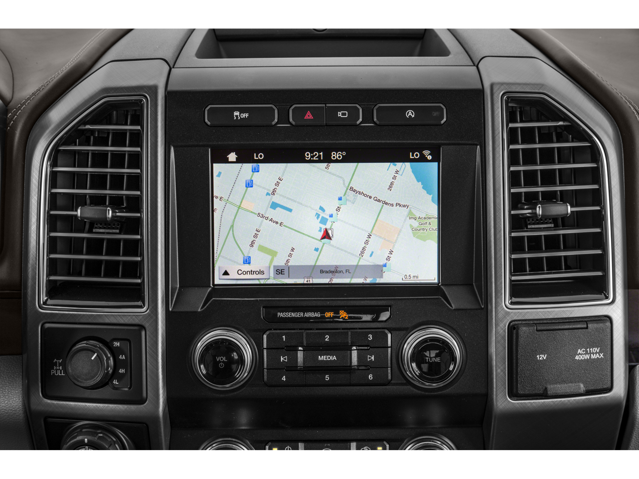 This vehicle includes the following features and options: Equipment Group 900A Base, GVWR: 6,750 lbs Payload Package, Trailer Tow Package (Class IV Trailer Hitch Receiver, Engine Oil Cooler, Pro Trailer Backup Assist, and Upgraded Front Stabilizer Bar), 4WD, 10 Speakers, 22 Polished Aluminum Wheels, 4-Wheel Disc Brakes, ABS brakes, Adjustable pedals, Air Conditioning, Alloy wheels, AM/FM radio: SiriusXM, AppLink/Apple CarPlay and Android Auto, Auto High-beam Headlights, Auto tilt-away steering wheel, Auto-dimming door mirrors, Auto-dimming Rear-View mirror, Automatic temperature control, Brake assist, Bumpers: body-color, Compass, Delay-off headlights, Driver door bin, Driver vanity mirror, Dual front impact airbags, Dual front side impact airbags, Electronic Locking w/3.55 Axle Ratio, Electronic Stability Control, Emergency communication system: SYNC 3 911 Assist, Exterior Parking Camera Rear, Front anti-roll bar, Front Bucket Seats, Front Center Armrest, Front dual zone A/C, Front fog lights, Front reading lights, Front wheel independent suspension, Fully automatic headlights, Garage door transmitter, Genuine wood door panel insert, Heated door mirrors, Heated front seats, Heated rear seats, Heated steering wheel, Illuminated entry, Low tire pressure warning, Memory seat, Navigation System, Occupant sensing airbag, Outside temperature display, Overhead airbag, Overhead console, Panic alarm, Passenger door bin, Passenger vanity mirror, Pedal memory, Power door mirrors, Power driver seat, Power moonroof, Power passenger seat, Power steering, Power windows, Radio data system, Radio: B&O Sound System by Bang & Olufsen, Rain sensing wipers, Rear reading lights, Rear seat center armrest, Rear step bumper, Rear window defroster, Remote keyless entry, Security system, SiriusXM Radio, Speed control, Speed-sensing steering, Split folding rear seat, Steering wheel memory, Steering wheel mounted audio controls, SYNC 3, Tachometer, Tailgate Step w/Tailgate Lift Assist, Telescoping steering wheel, Tilt steering wheel, Traction control, Trip computer, Turn signal indicator mirrors, Unique Leather Bucket Seats, Variably intermittent wipers, Ventilated front seats, Voice-Activated Touchscreen Navigation, and Voltmeter.
