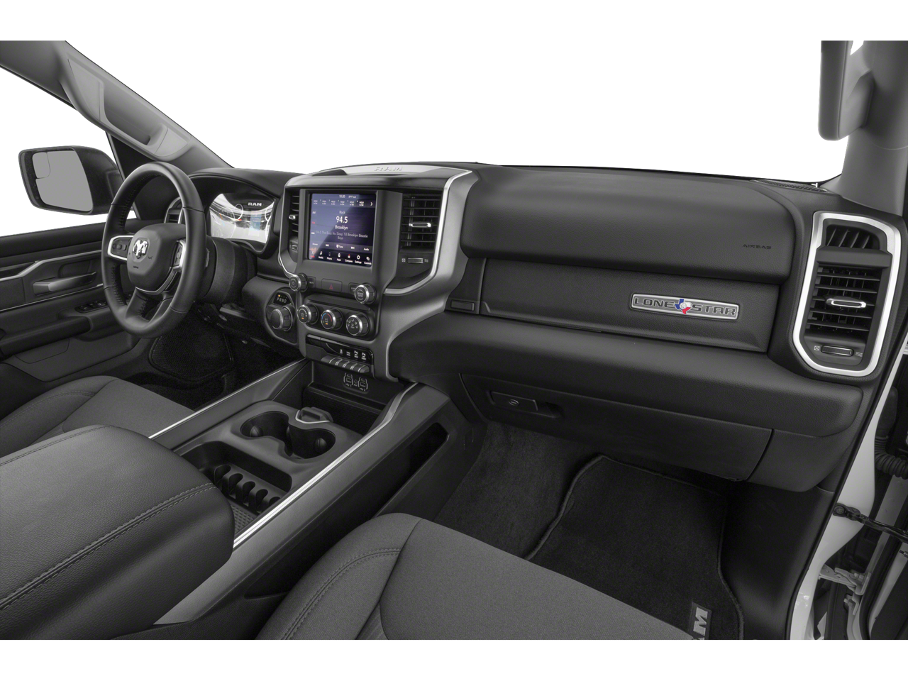 This vehicle includes the following features and options: Big Horn Level 2 Equipment Group (115V Auxiliary Power Outlet, 115V Auxiliary Rear Power Outlet, 2 USB Full Function/Charge Only Media Hub, 400W Inverter, 8.4 Touchscreen Display, Air Conditioning ATC w/Dual Zone Control, Auto-Dimming Rear-View Mirror, Big Horn IP Badge, Class IV Receiver Hitch, Cluster 7.0 TFT Color Display, Dampened Tailgate, Foam Bottle Insert (Door Trim Panel), Glove Box Lamp, Heated Front Seats, Heated Steering Wheel, Integrated Center Stack Radio, ParkSense Front/Rear Park Assist w/Stop, Power 4-Way Driver Lumbar Adjust, Power 8-Way Driver Seat, Power Adjustable Pedals, Power Heated Fold Away Mirrors, Radio: Uconnect 4 w/8.4 Display, Rear Dome w/On/Off Switch Lamp, Rear Power Sliding Window, Rear Window Defroster, Remote Start System, Security Alarm, Single Disc Remote CD Player, SiriusXM Satellite Radio, Sun Visors w/Illuminated Vanity Mirrors, and Universal Garage Door Opener), Quick Order Package 25Z Big Horn/Lone Star (Steering Wheel Mounted Audio Controls), 3 Rear Seat Head Restraints, 3.21 Rear Axle Ratio, 4 Way Front Headrests, 4-Wheel Disc Brakes, 48V Belt Starter Generator, 6 Speakers, ABS brakes, Air Conditioning, Alloy wheels, AM/FM radio, Brake assist, Bumpers: chrome, Cloth Bench Seat, Compass, Delay-off headlights, Driver door bin, Dual front impact airbags, Dual front side impact airbags, Electronic Stability Control, Front anti-roll bar, Front Center Armrest w/Storage, Front fog lights, Front reading lights, Front Seat Back Map Pockets, Front wheel independent suspension, Fully automatic headlights, GPS Antenna Input, Heated door mirrors, Illuminated entry, Leather steering wheel, Low tire pressure warning, Manufacturer's Statement of Origin, Occupant sensing airbag, Outside temperature display, Overhead airbag, Overhead console, Panic alarm, ParkView Rear Back-Up Camera, Passenger door bin, Passenger vanity mirror, Power door mirrors, Power steering, Power windows, Radio data system, Radio: Uconnect 3 w/5 Display, Rear 60/40 Folding Seat, Rear anti-roll bar, Rear seat center armrest, Rear step bumper, Remote keyless entry, Speed control, Split folding rear seat, Tachometer, Telescoping steering wheel, Tilt steering wheel, Traction control, Trip computer, Variably intermittent wipers, Voltmeter, and Wheels: 18 x 8.