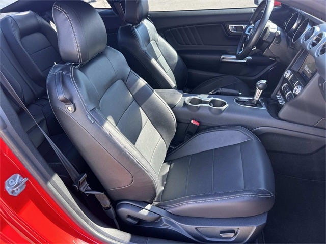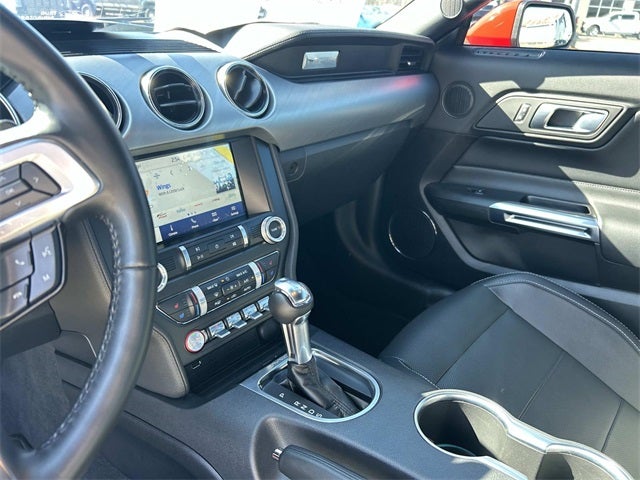 This vehicle includes the following features and options: Equipment Group 400A, Mustang GT Premium, Ford Blue Advantage: Blue Certified Certified, 20 Wheels, 3.55 Limited Slip Rear Axle, 4-Wheel Disc Brakes, 9 Speakers, ABS brakes, Active Valve Performance Exhaust, Air Conditioning, Alloy wheels, AM/FM radio: SiriusXM, AM/FM Stereo, Auto High-beam Headlights, Auto-dimming Rear-View mirror, Automatic temperature control, Brake assist, Bumpers: body-color, Climate Controlled Heated/Cooled Front Seats, Compass, Delay-off headlights, Driver door bin, Driver vanity mirror, Dual front impact airbags, Dual front side impact airbags, Electronic Stability Control, Emergency communication system: 911 Assist, Exterior Parking Camera Rear, Four wheel independent suspension, Front anti-roll bar, Front Bucket Seats, Front Center Armrest, Front dual zone A/C, Front fog lights, Front reading lights, Fully automatic headlights, Garage door transmitter, Heated door mirrors, Heated front seats, Illuminated entry, Knee airbag, Leather Shift Knob, Leather-Trimmed Bucket Seats, Low tire pressure warning, Occupant sensing airbag, Outside temperature display, Overhead airbag, Overhead console, Panic alarm, Passenger door bin, Passenger vanity mirror, Power door mirrors, Power driver seat, Power passenger seat, Power steering, Power windows, Radio data system, Rain sensing wipers, Rear anti-roll bar, Rear Parking Sensors, Rear window defroster, Remote keyless entry, Security system, SiriusXM Radio, Speed control, Speed-sensing steering, Speed-Sensitive Wipers, Split folding rear seat, Spoiler, Steering wheel mounted audio controls, SYNC 3 Communications & Entertainment System, Tachometer, Telescoping steering wheel, Tilt steering wheel, Traction control, Trip computer, Variably intermittent wipers, Ventilated front seats, Voltmeter, Wheels: 18 x 8 Machined-Face Aluminum, and Wheels: 20 x 9 Premium-Painted Aluminum.