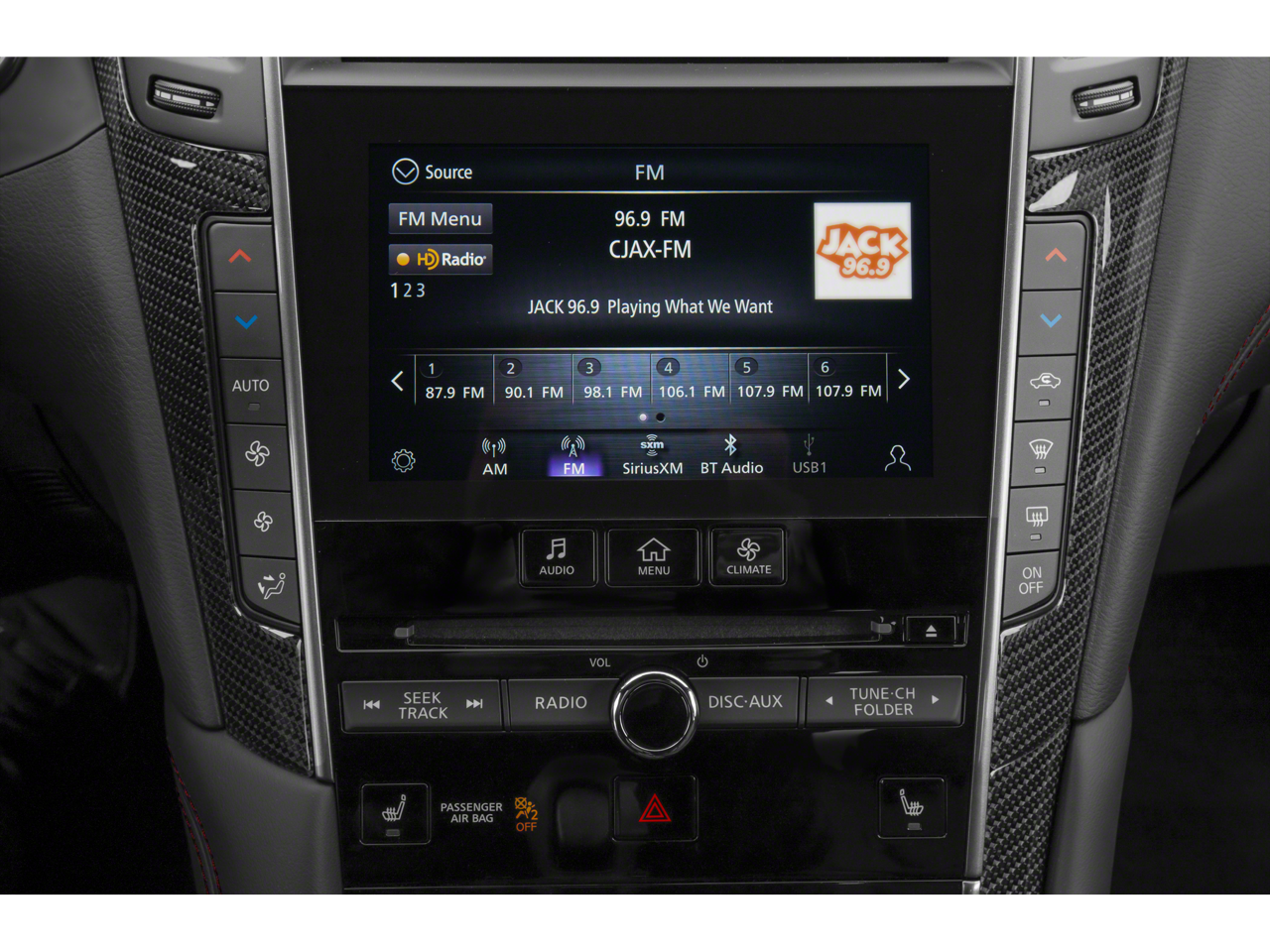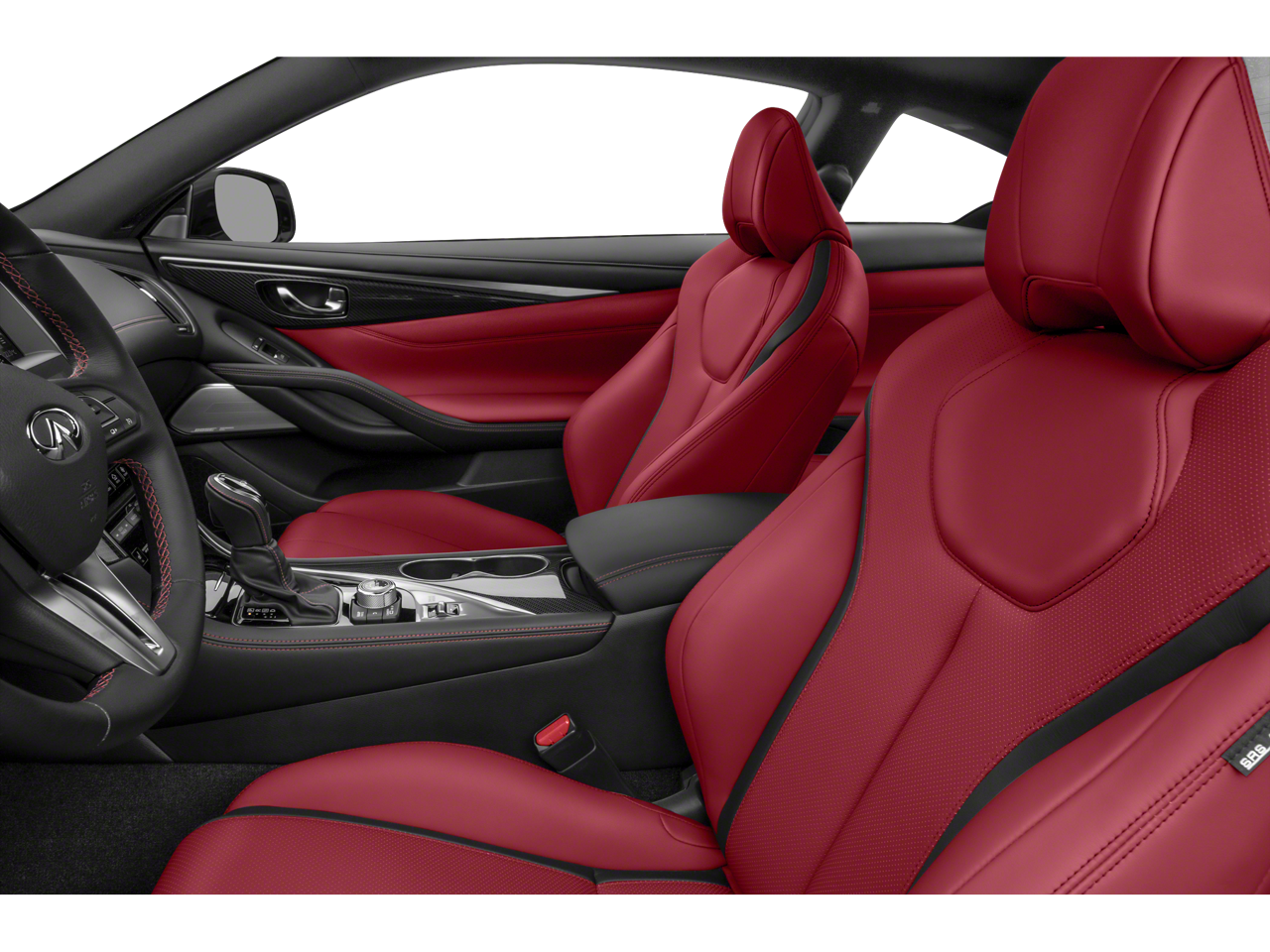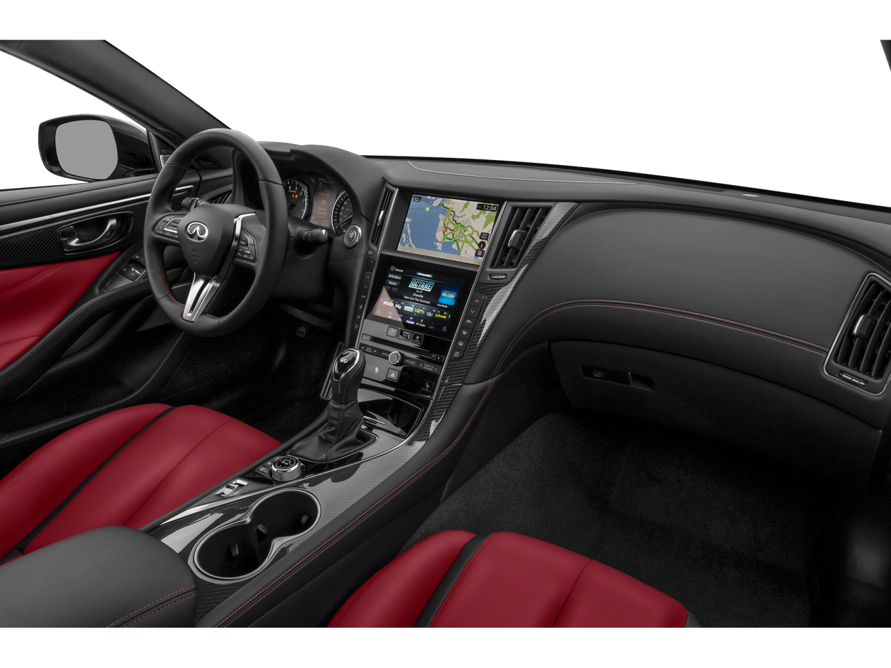 This vehicle includes the following features and options: Carbon Fiber Package (Fender Vents, Mirror Caps, and Rear Spoiler), Cargo Package (Cargo Net, Carpeted Trunk Mat, and First Aid Kit), ProACTIVE Package (Active Lane Control, Adaptive Front Lighting System, Blind-Spot Intervention, Direct Adaptive Steering, ECO Pedal, Front Seat Driver/Passenger Pre-Crash Seatbelts, and Lane Departure Prevention), Navigation system: INFINITI InTouch Navigation, 13 Speakers, 4-Wheel Disc Brakes, ABS brakes, Adaptive suspension, Air Conditioning, Alloy wheels, AM/FM radio: SiriusXM, Apple CarPlay/Android Auto, Auto High-beam Headlights, Auto tilt-away steering wheel, Auto-dimming door mirrors, Auto-dimming Rear-View mirror, Automatic temperature control, Blind Spot Warning, Brake assist, Bumpers: body-color, CD player, Compass, Delay-off headlights, Driver door bin, Driver vanity mirror, Dual front impact airbags, Dual front side impact airbags, Electronic Stability Control, Emergency communication system: INFINITI Connection, Four wheel independent suspension, Front anti-roll bar, Front Bucket Seats, Front Center Armrest, Front dual zone A/C, Front fog lights, Front reading lights, Fully automatic headlights, Garage door transmitter: HomeLink, Heated door mirrors, Heated Front Bucket Seats, Heated front seats, Heated steering wheel, Illuminated entry, Illuminated Kick Plates, INFINITI Welcome Lighting, Leather Shift Knob, Leather steering wheel, Literature Kit, Low tire pressure warning, Memory seat, Occupant sensing airbag, Outside temperature display, Overhead airbag, Overhead console, Panic alarm, Passenger door bin, Passenger vanity mirror, Power door mirrors, Power driver seat, Power moonroof, Power passenger seat, Power steering, Power windows, Radio data system, Radio: INFINITI InTouch w/AM/FM/HD/CD/Navigation, Rain sensing wipers, Rear anti-roll bar, Rear window defroster, Remote keyless entry, Security system, Semi-Aniline Leather-Appointed Seating Surfaces, Speed control, Speed-sensing steering, Speed-Sensitive Wipers, Steering wheel memory, Steering wheel mounted audio controls, Tachometer, Telescoping steering wheel, Tilt steering wheel, Traction control, Trip computer, Turn signal indicator mirrors, Variably intermittent wipers, and Wheels: 20 Staggered Aluminum-Alloy Sport.