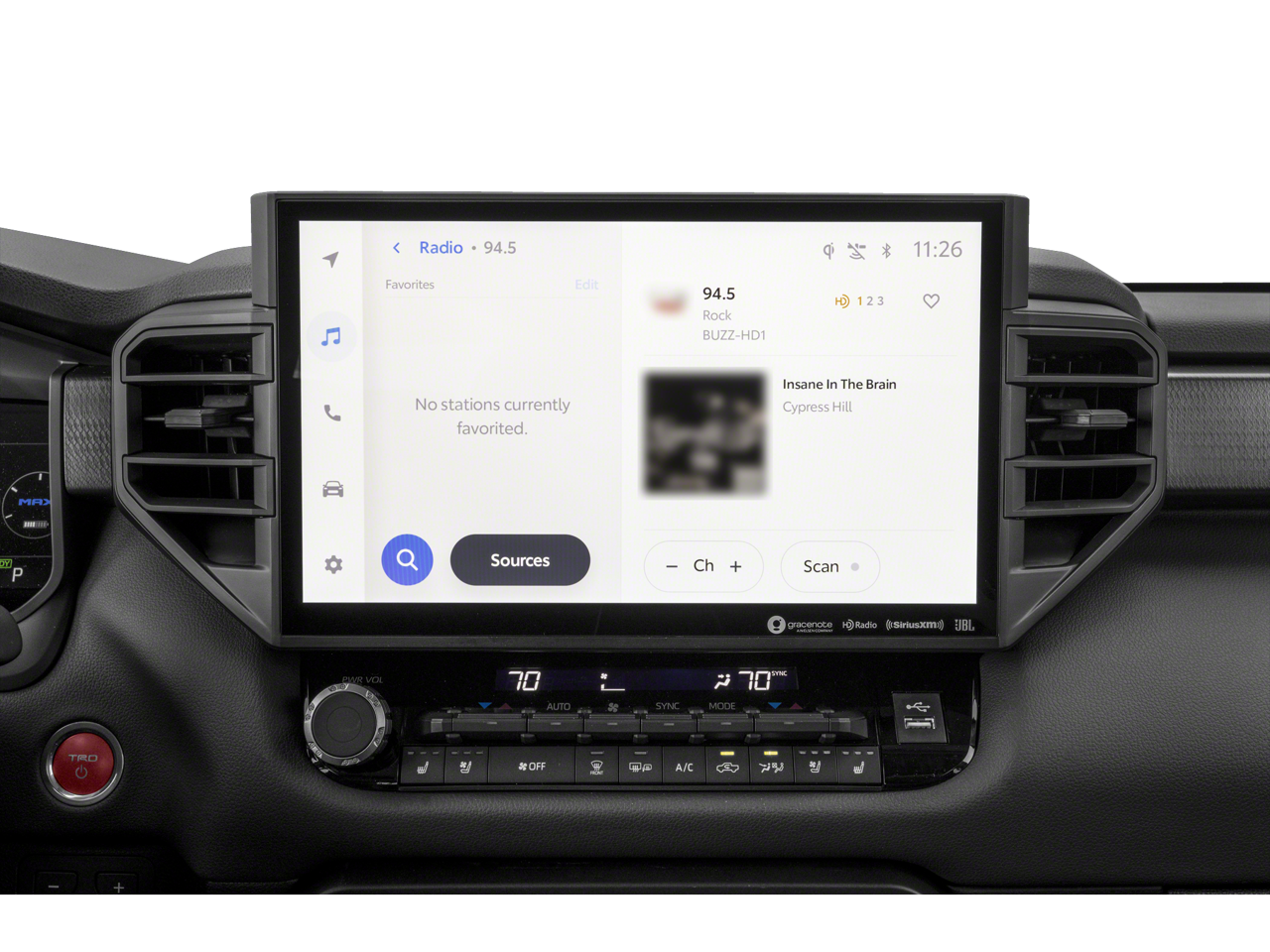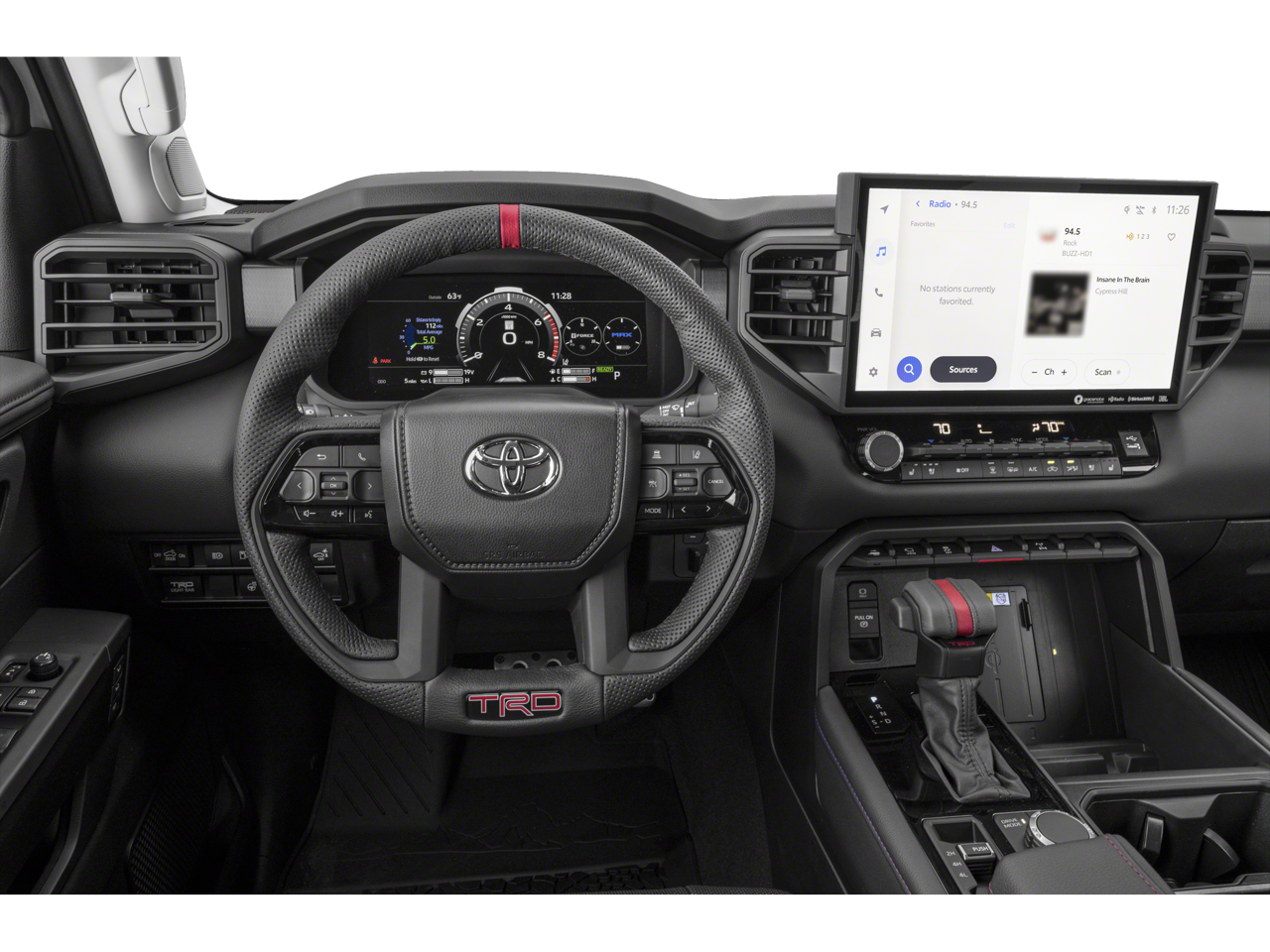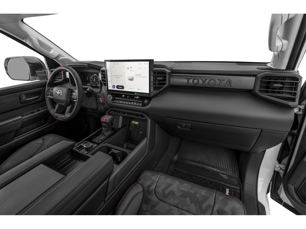 This vehicle includes the following features and options: Bed Utility Package w/Extender (TMS), Security Package (TMS), Towing Technology Package, TRD Pro Tow Package (400W/120V AC Rear Seat & Bed Power Supply, Black Dual Exhaust Tips w/Debossed TRD Pro Logo, Front & Rear Mud Guards, Heated Power Sideview Mirrors w/LED Turn Signals, LED Lightbar w/Fog & Marker Lights, Multi-Terrain Back Monitor, Panoramic View Back Monitor, Power Panoramic Roof, Qi-Compatible Wireless Smartphone Charger, Smoked-Finish Premium LED Headlights & DRL, and TRD Pro Heated Leather-Trimmed Steering Wheel), 3.4L V6, 12 Speakers, 3.31 Axle Ratio, 4-Wheel Disc Brakes, ABS brakes, Air Conditioning, Alloy wheels, AM/FM radio: SiriusXM, Apple CarPlay/Android Auto, Auto High-beam Headlights, Auto-dimming door mirrors, Auto-dimming Rear-View mirror, Automatic temperature control, Ball Mount (TMS), Black Front Bumper Letters (TMS), Brake assist, Bumpers: body-color, Cargo Net (TMS), Cargo Tote (TMS), Coin Holder/Ashtray Cup (TMS), Delay-off headlights, Driver door bin, Driver vanity mirror, Dual front impact airbags, Dual front side impact airbags, Electronic Stability Control, Emergency Assistance Kit (TMS), Emergency communication system: Safety Connect (10-year trial), Front anti-roll bar, Front Bucket Seats, Front Center Armrest, Front dual zone A/C, Front fog lights, Front reading lights, Front wheel independent suspension, Fully automatic headlights, Garage door transmitter: HomeLink, Heated & Ventilated Front Bucket Seats, Heated Color-Keyed Outside Mirrors, Heated door mirrors, Heated front seats, Heated steering wheel, Illuminated entry, Knee airbag, Leather Shift Knob, Low tire pressure warning, Memory seat, Mini-Tie Down (TMS), Navigation System, Occupant sensing airbag, Outside temperature display, Overhead airbag, Overhead console, Paint Protection Film (TMS), Panic alarm, Passenger door bin, Passenger vanity mirror, Power door mirrors, Power driver seat, Power moonroof, Power passenger seat, Power steering, Power windows, Radio data system, Radio: Premium Audio w/JBL, Rear reading lights, Rear seat center armrest, Rear step bumper, Rear window defroster, Remote keyless entry, Security system, SofTex Seat Trim, Speed control, Speed-sensing steering, Split folding rear seat, Sport steering wheel, Stainless Steel Door Edge Guards (TMS), Steering wheel mounted audio controls, Tachometer, Telescoping steering wheel, Tilt steering wheel, Traction control, TRD Performance Air Filter (TMS), TRD Pro Reflective Bed Lettering (TMS), Trip computer, Turn signal indicator mirrors, USB Phone Charging Cable Kit (TMS), Variably intermittent wipers, Ventilated front seats, Voltmeter, Wheel Locks (TMS), and Wheels: 18 x 8 Black BBS Forged Aluminum.