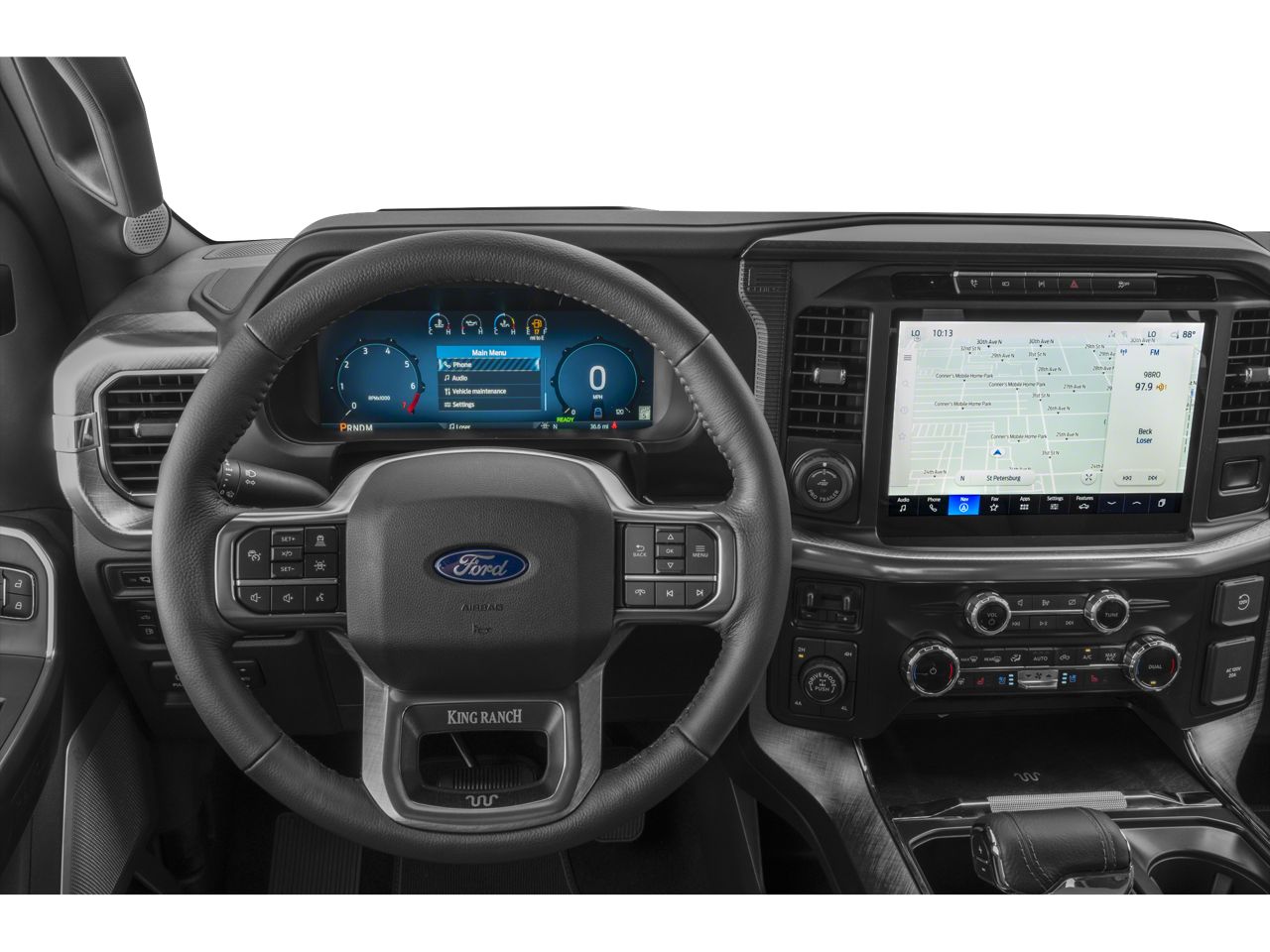 This vehicle includes the following features and options: Equipment Group 601A High, FX4 Off-Road Package (4x4 FX4 Off-Road Bodyside Decal, Hill Descent Control, Monotube Rear Shocks, Off-Road Tuned Front Shock Absorbers, Rock Crawl Mode, and Tray Style Floor Liner), Ford Blue Advantage: Blue Certified Certified, 4WD, Navigation system: Connected Navigation, 14 Speakers, 4-Wheel Disc Brakes, ABS brakes, Adaptive suspension, Adjustable pedals, Air Conditioning, Alloy wheels, AM/FM radio: SiriusXM with 360L, Auto High-beam Headlights, Auto-dimming door mirrors, Auto-dimming Rear-View mirror, Automatic temperature control, Brake assist, Chrome wheels, Compass, Delay-off headlights, Driver door bin, Driver vanity mirror, Dual front impact airbags, Dual front side impact airbags, Electronic Stability Control, Emergency communication system: SYNC 4 911 Assist, Front anti-roll bar, Front Bucket Seats, Front Center Armrest, Front dual zone A/C, Front fog lights, Front reading lights, Front wheel independent suspension, Fully automatic headlights, Garage door transmitter, Genuine wood dashboard insert, Heads-Up Display, Heated door mirrors, Heated front seats, Heated rear seats, Heated steering wheel, Illuminated entry, King Ranch Leather Bucket Seats, Low tire pressure warning, Max Recline Driver & Passenger Seat, Memory seat, Occupant sensing airbag, Outside temperature display, Overhead airbag, Overhead console, Panic alarm, Passenger door bin, Passenger vanity mirror, Pedal memory, Power door mirrors, Power driver seat, Power moonroof, Power passenger seat, Power steering, Power windows, Radio data system, Radio: B&O Unleashed Sound System by Bang & Olufsen, Rain sensing wipers, Rear reading lights, Rear seat center armrest, Rear step bumper, Rear window defroster, Remote keyless entry, Security system, Speed control, Split folding rear seat, Steering wheel mounted audio controls, SYNC 4 w/Enhanced Voice Recognition, Tachometer, Telescoping steering wheel, Tilt steering wheel, Traction control, Trip computer, Turn signal indicator mirrors, Variably intermittent wipers, Ventilated front seats, Voltmeter, and Wheels: 20 Chrome-Like PVD.